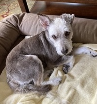 Hello. My name is Milo. You guys might remember me as ‘Yoda’. My mom (Amy) adopted me 15 years ago last week! I am now 17 years old and still love going for walks, swimming and cannot get enough of my mom! She even gave me another little hoooman that drops treats on the floor for me! We love to travel; mom says I am a navigational specialist (important job). Thanks for helping me find my mom!